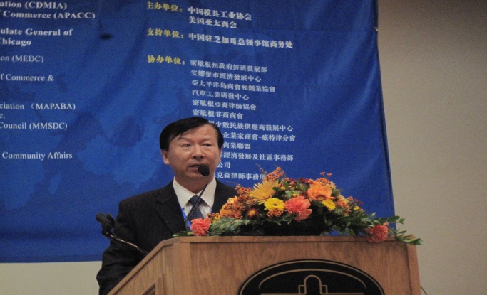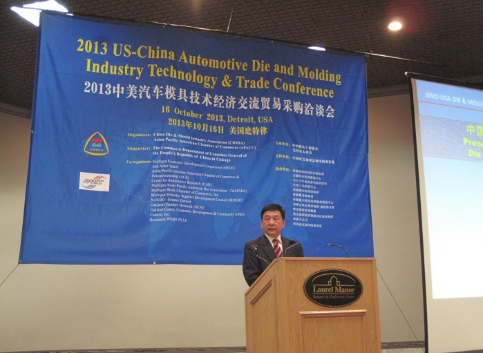 1,中國模具工業協會常務副會長兼秘書長武兵書做了“中國模具的現狀和發展前景”的報告。武兵書秘書長首先代表中國模協感謝本次活動的合作者和密歇根州政府經濟發展署簽發的邀請函,正是他們的積極努力和熱情支持,使得本次活動的中國代表團全部順利取得簽證并按計劃出席這次活動。隨后他介紹了中國模具工業概況,重點談了中國模具工業近30年的發展:建立了較完整的模具工業體系、模具產能及進出口增長迅速、中美模具(技術)貿易歷史悠久并發展勢頭強勁等。他在講演時還分析了中國模具市場,特別是汽車模具市場發展情況,歡迎美國三大汽車更多參與中國汽車模具技術和產品的交流和貿易。他還介紹了參加本次活動的中國模具企業。