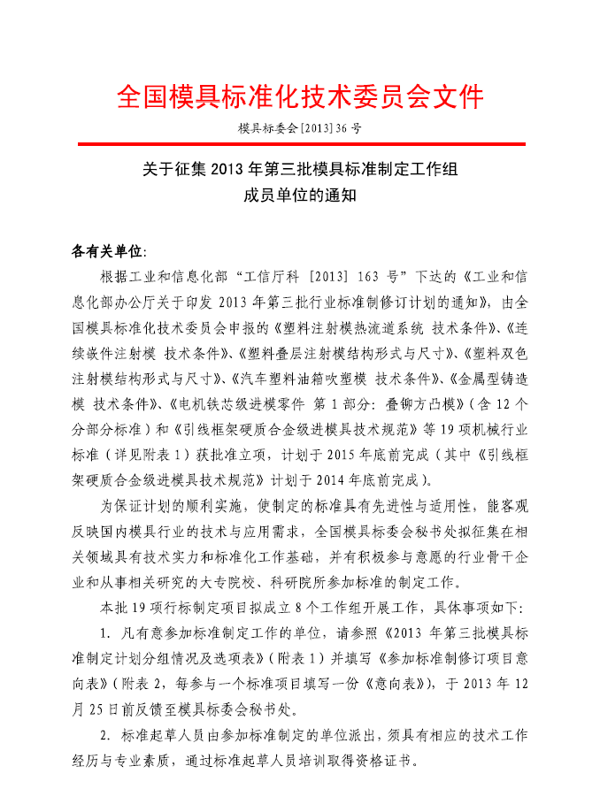 關于征集2013年第三批模具標準制定工作組成員單位的通知