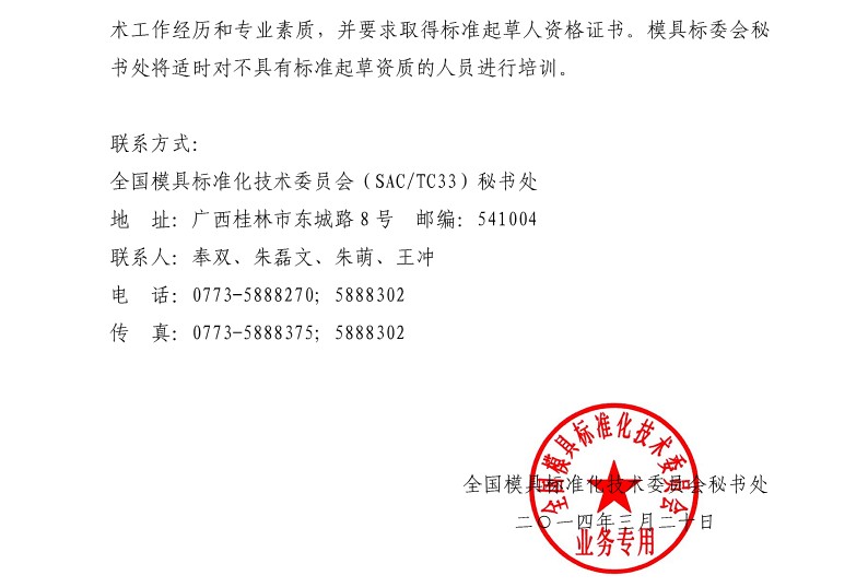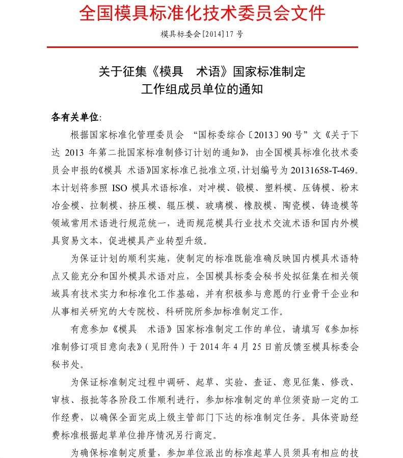 關于征集《模具 術語》國家標準制定工作組成員單位的通知