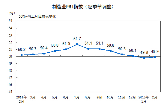 2015年2月,中國制造業采購經理指數(PMI)為49.9%,比上月微升0.1個百分點,表明制造業收縮幅度收窄。