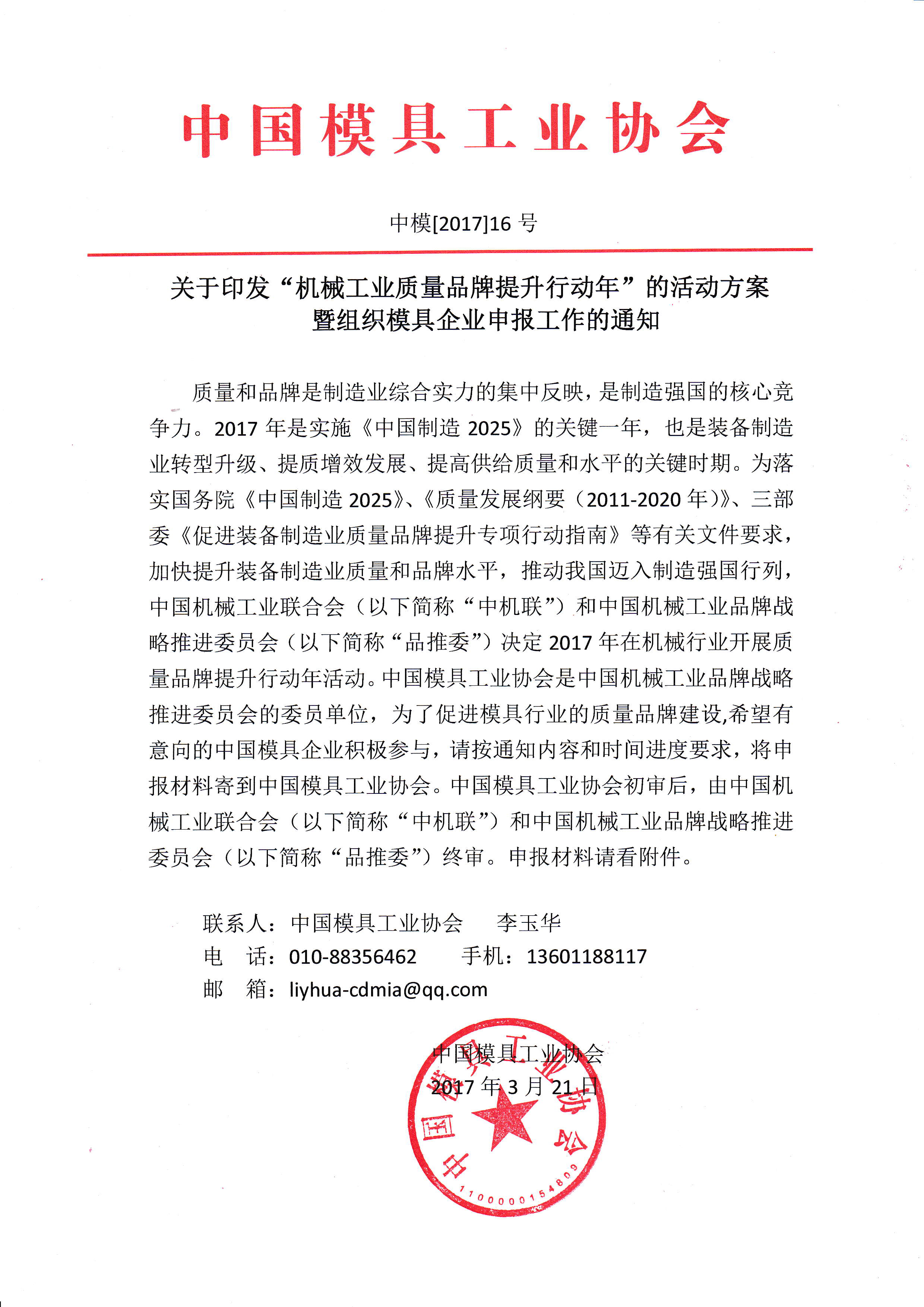 關于印發“機械工業質量品牌提升行動年”的活動方案暨組織模具企業申報工作的通知
