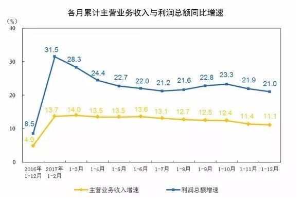 據國家統計局工業司何平博士解讀表示,2017年,中國規模以上工業企業實現利潤75187.1億元,比上年增長21%,增速比2016年加快12.5個百分點,是2012年以來增速最高的一年。