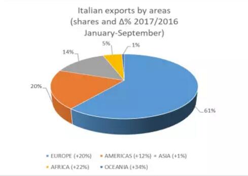 大陸的份額已增長到近61%,其中歐盟占總量的50%。歐洲(+ 20%)的強勁表現歸因于,意大利制造商3個傳統市場—德國(+ 25%)、西班牙(+ 11%)和法國(+ 15%)的銷售量大幅增加。