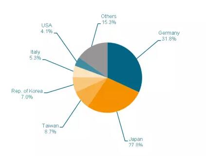 根據德國機械設備制造業聯合會(VDMA)、德國國家統計局統計的52個報告國家的出口數據,2016年全球塑料和橡膠機械向中國的供應量達到19.7億歐元,與上年相比下降了7.1%。德國在全球對華出口中排名第一,占31.8%,其次是日本(27.8%)、臺灣(8.7%)和韓國(7.0%)。