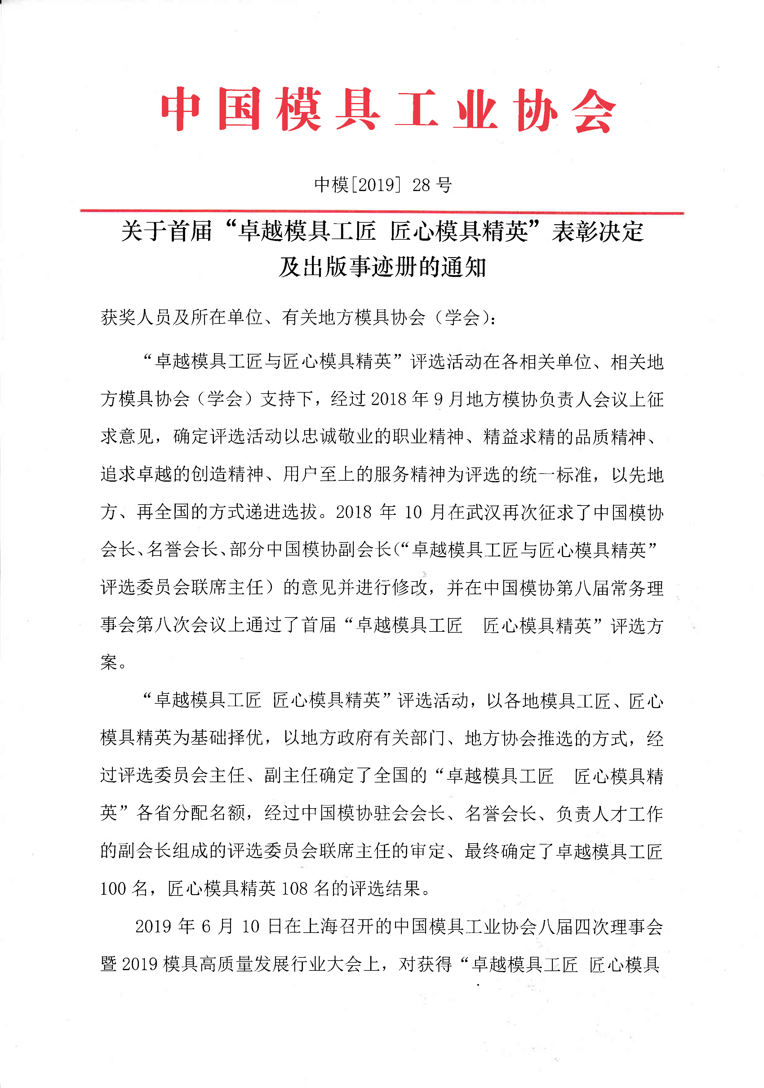 關于首屆“卓越模具工匠 匠心模具精英”表彰決定及出版事跡冊的通知