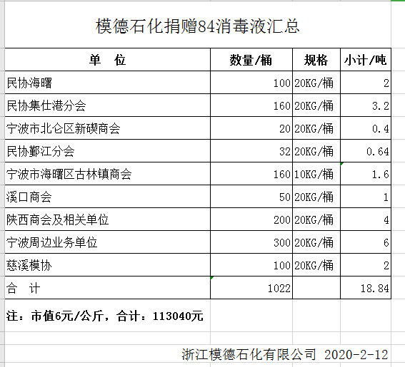 隨著新冠肺炎疫情的發展以及防控需求的不斷增大,消毒用品成為當下最緊缺的物資之一。中國模協理事、中國模協裝備委員會副主任,寧波市陜西商會副會長、浙江模德石化有限公司總經理趙小軍意識到此次疫情對社會的影響與自身的擔當,在當前防疫需求緊迫和供應困難的情況下, 2月8日迅速做出一個重要的決定,通過有效平臺向大型超市、快遞公司、倉儲物流、酒店賓館、餐飲企業、中小制造企業及公益單位無償捐贈84消毒液,在寧波海曙區民營企業協會等機構的穿針引線下為轄區企業防疫提供盡可能的消毒產品供給,盡快安全復工提供幫助。