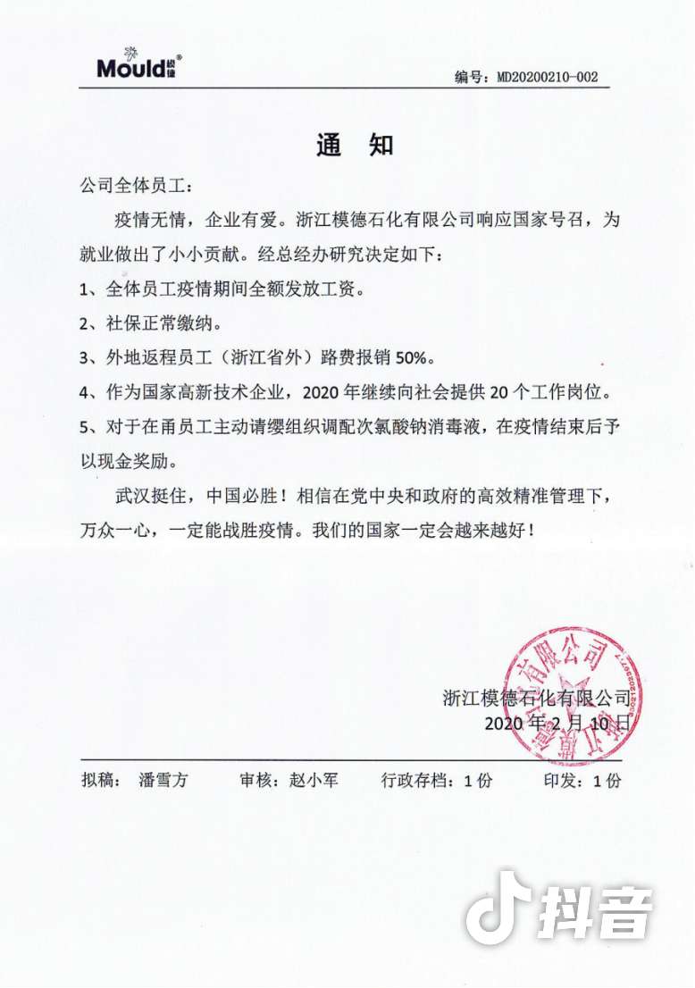 模德石化有限公司致全體職工的通知感染了我們,疫情無情,我們有愛!5條舉措實實在在為我們呈現了一個企業家的擔當與責任!這樣的企業一定是一個可以信賴的長久合作企業!一定是一個支撐模具企業發展的緊密伙伴企業!