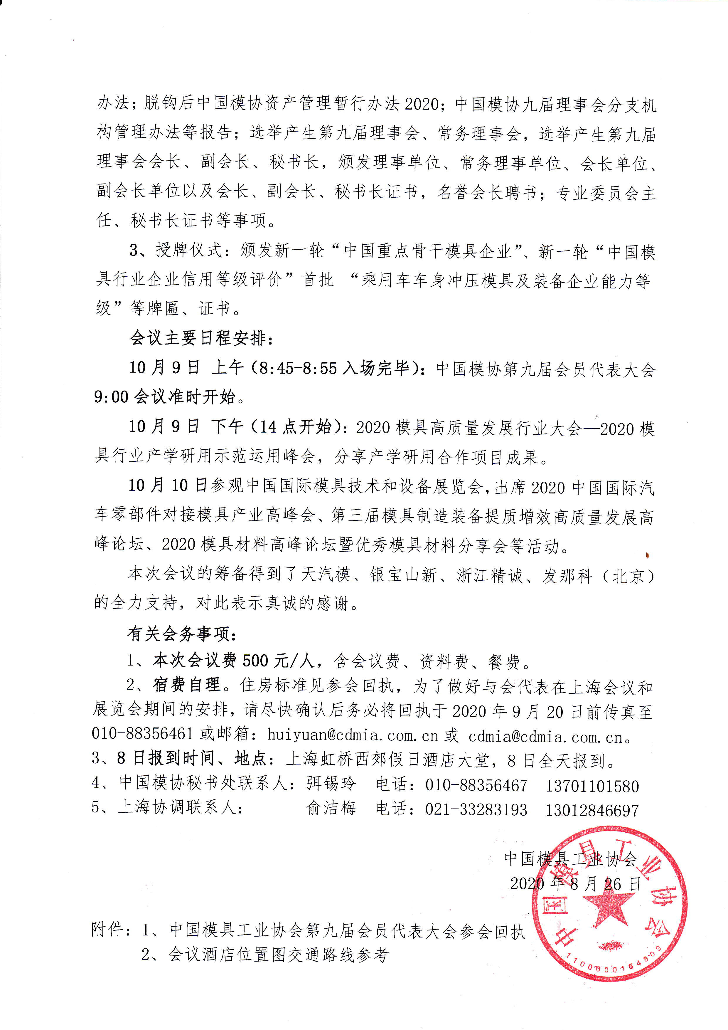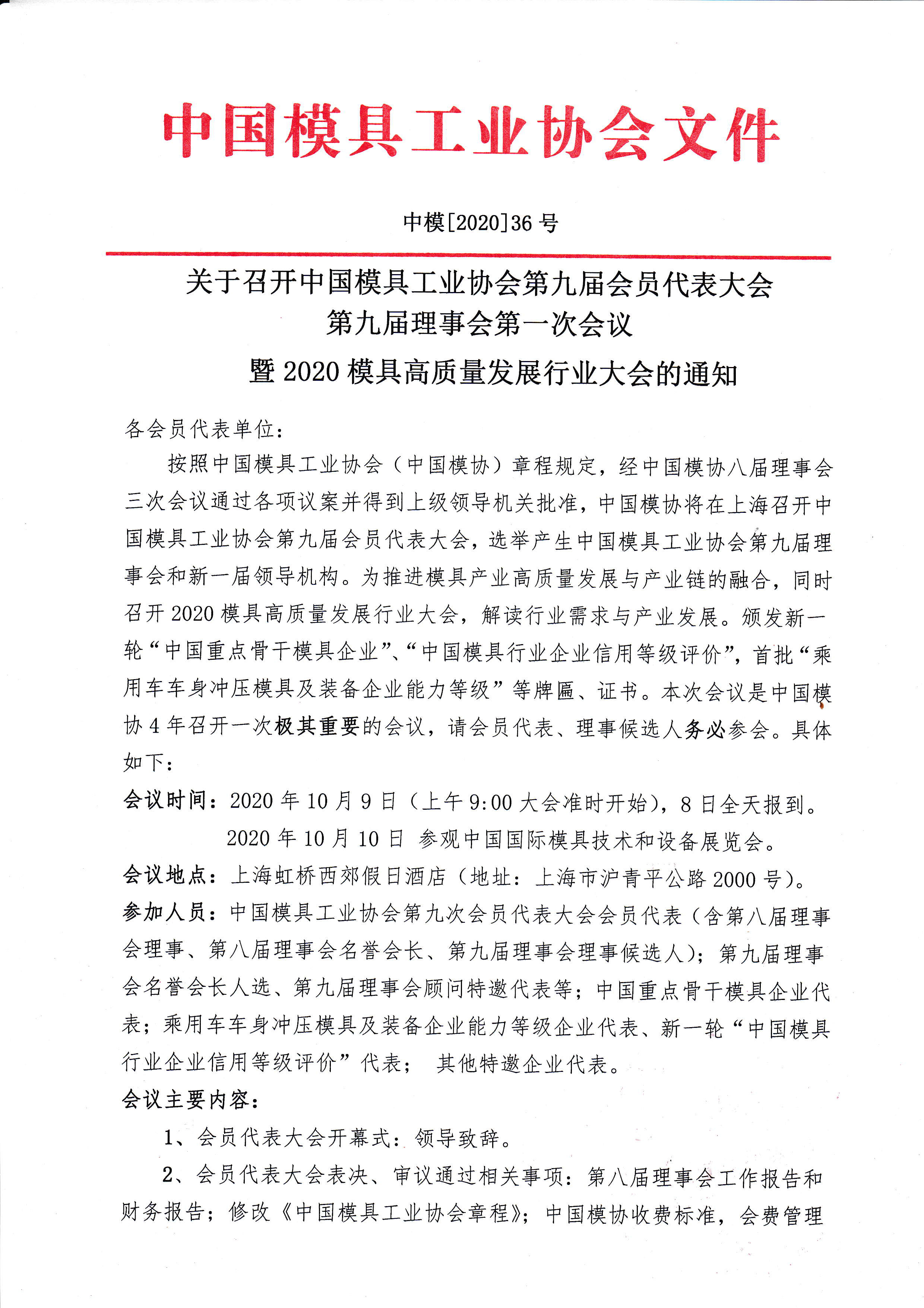 關于召開中國模具工業協會第九屆會員代表大會 第九屆理事會第一次會議暨2020模具高質量發展行業大會的通知